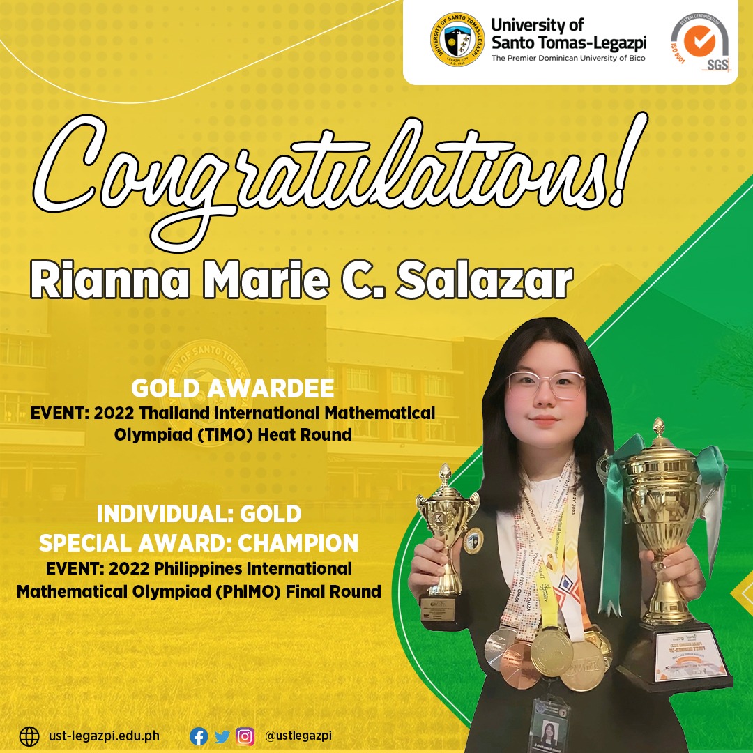 Congratulations to Rianna Marie C. Salazar from the Junior High School Department for being a Gold awardee at the 2022 Thailand International Mathematical Olympiad (TIMO) Heat Round and Individual Gol and Champion at the 2022 Philippine International Mathematical Olympiad (PhIMO) Final Round!