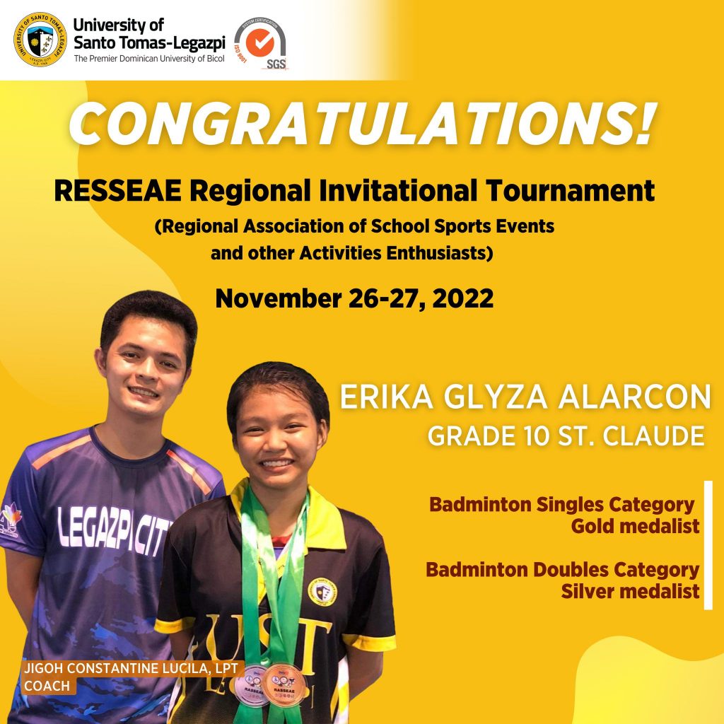 Congratulations to Erika Glyza Alarcon from the Junior High School Department for winning Gold in Badminton Singles Category and Silver in the Badminton Doubles Category at the 2022 Regional Association of School Sports Events and other Activities Enthusiasts!